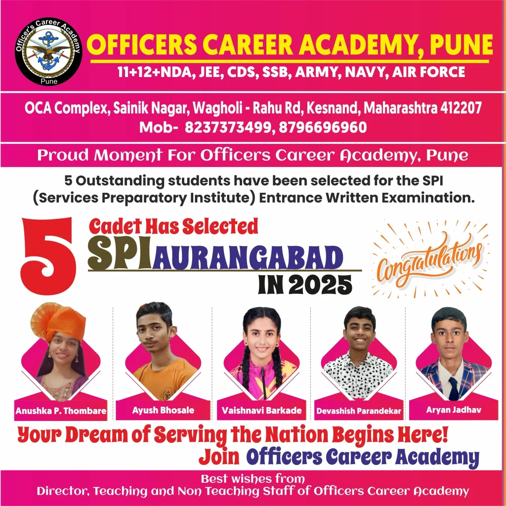 Congratulation OCA Cadets Sanket Kakade, Mahesh Borade, Gagan, Rahul Chavan, Suraj Divekar, Shambhu Kashid, Tanesh Deshmukh, Pratap Kachole, Ayesha Mulla, Anjali Thengane, Akshada Naikwadi, Anjali Ram, Shraddha Kauthale, Parth Babade, Isha Ingale, Nikita Gaidhane, Palak Jadhav, Trushna Thavkar, Bhavesh More, Ranjeet Sonawane for Air-Force Phase one exam cleared